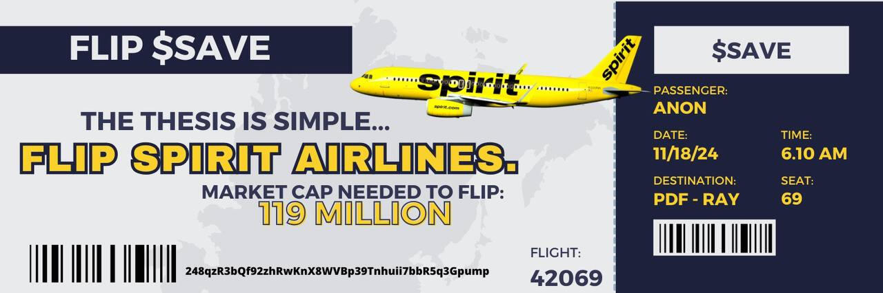 About $SAVE: Saving Spirit AirlinesThe thesis is simple. We flip Spirit airlines. $118M Market cap. Imagine the news when they learn that $SAVE flipped an airline with billions of assets. A win for SOL and this thesis will finally start the super cycle after all the normies see this meme. INSHALLAH
